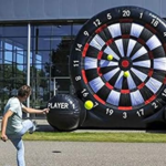 Our Giant Dart Soccer rental is the perfect combination of soccer and shooting darts. It gives you the opportunity to have a friendly competition between friends and/or coworkers as you aim for the center of the 9-foot dartboard using our special soccer balls.